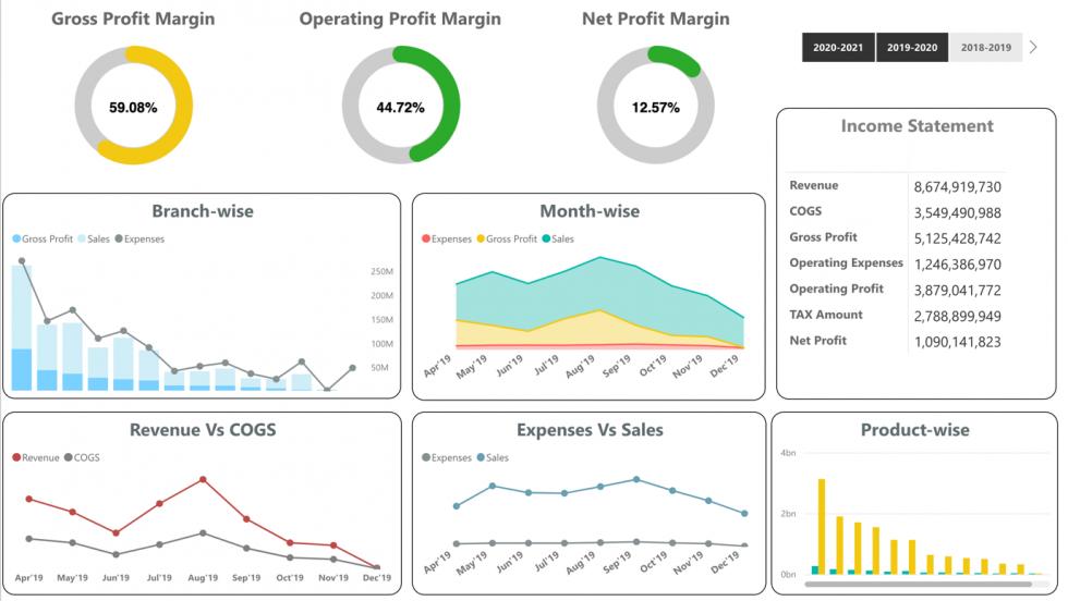 For example, you want to see the exact net profit or sold units of your management strategy. By simply clicking on the specific KPI (in this case the net profit), the drill-down will enable you to visualize this data in a clear manner, without the need to be presented in the main screen. There are many KPI examples you can choose specifically for your business, and this is just one that shows the tip of the iceberg of the power of interactivity.